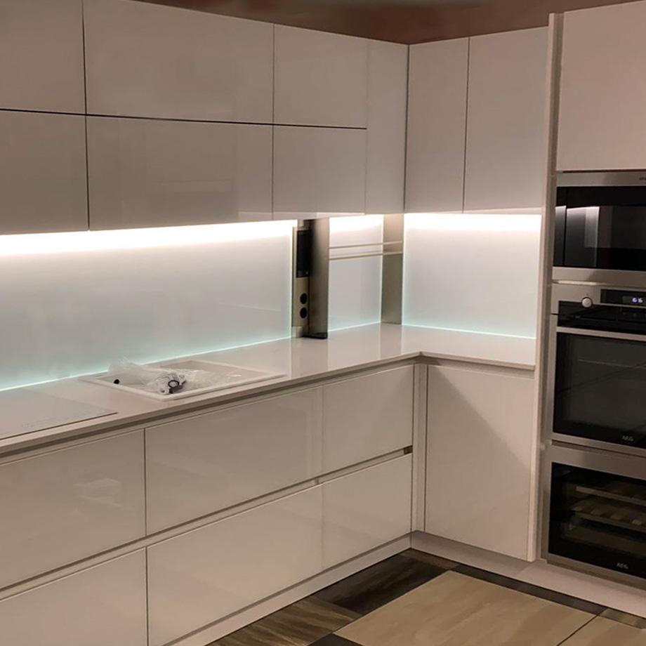 Questo progetto di arredamento cucina è interamente incentrato su uno spazio relativamente contenuto che è stato ottimizzato e valorizzato grazie alla linearità del modello scelto dalla nostra cliente, così come dalla luminosità esaltata dal pet cachemere opaco dei pensili. Ma non solo, la finitura lucida della parete con led integrati è un elemento di design capace di sprigionare un effetto suggestivo durante i momenti più raccolti vissuti durante le ore serali, quando la luce si fa soffusa.
